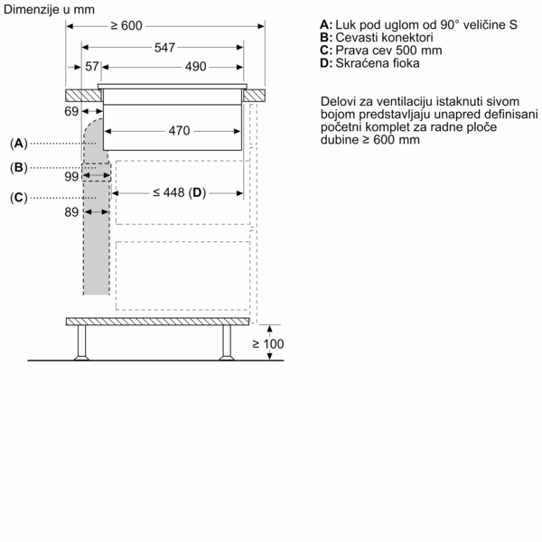 - Osnovni komplet dodatnog pribora za konfiguracije odvoda putem cevi vaše ploče za kuvanje sa ugrađenim modulom za ventilaciju u kuhinjama u kojima je radna ploča dubine 60 cm ili više.