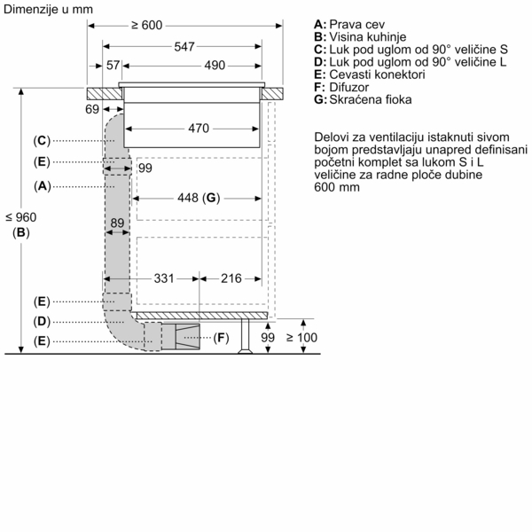 - Komplet dodatnog pribora za konfiguracije za recirkulaciju delimično putem cevi vaše ploče za kuvanje sa ugrađenim modulom za ventilaciju u kuhinjama u kojima je dubina radne ploče 60 cm ili više.
